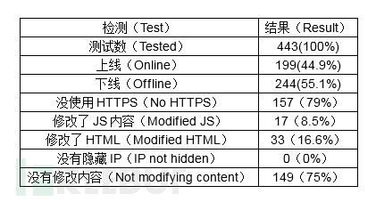 仅仅因为一个代理服务器“不积极”地修改你的内容,这并不意味着它就是安全的。使用免费代理服务器的的唯一安全的方法就是如果HTTPS可用,你只访问实施HTTPS的站点即可。 只有21%代理服务器使用了HTTPS。 令人震惊的结果 出乎意料的是,会有如此多的代理禁止HTTPS流量。代理服务器这么做可能是因为他们想让你使用HTTP,这样它就能分析你的流量并窃取你的登录凭证了。 199个代理服务器中只有17个(8.5%)修改JS,他们中大多出都被注入了客户广告。但是其中只有两个是错误信息或者web过滤器警告。